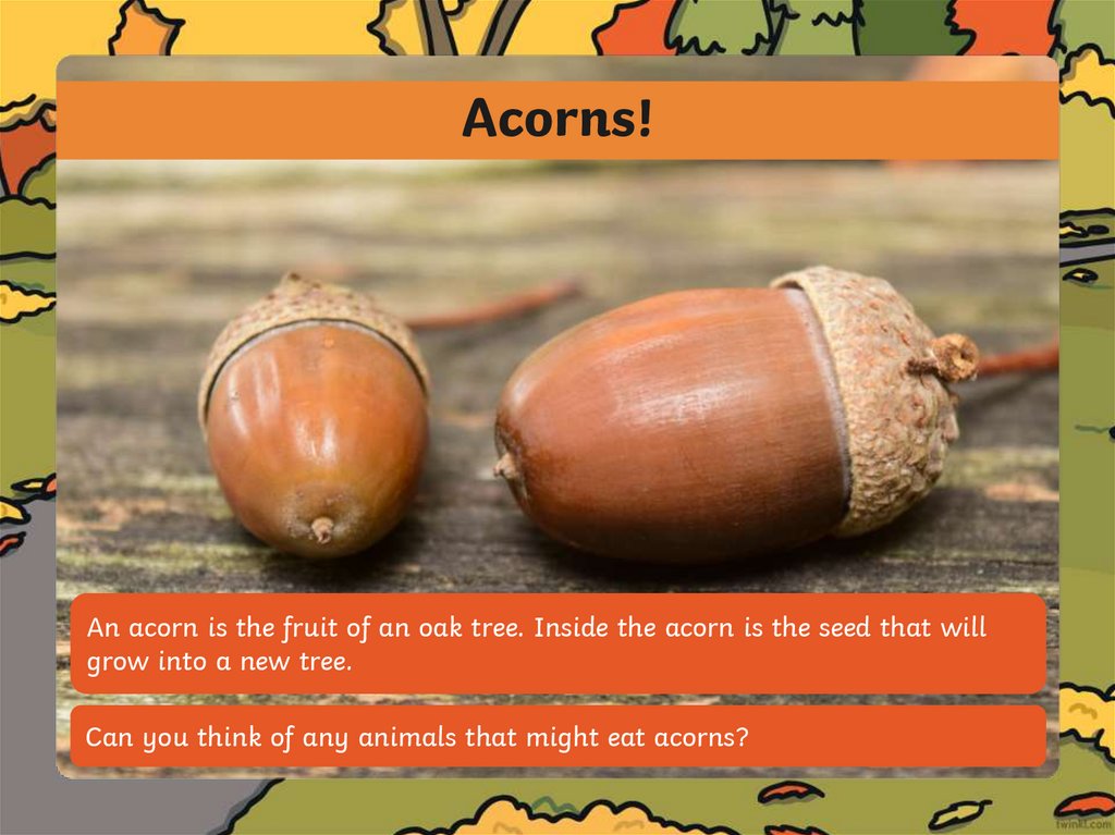 Acorns!An acorn is the fruit of an oak tree. Inside the acorn is the seed that will