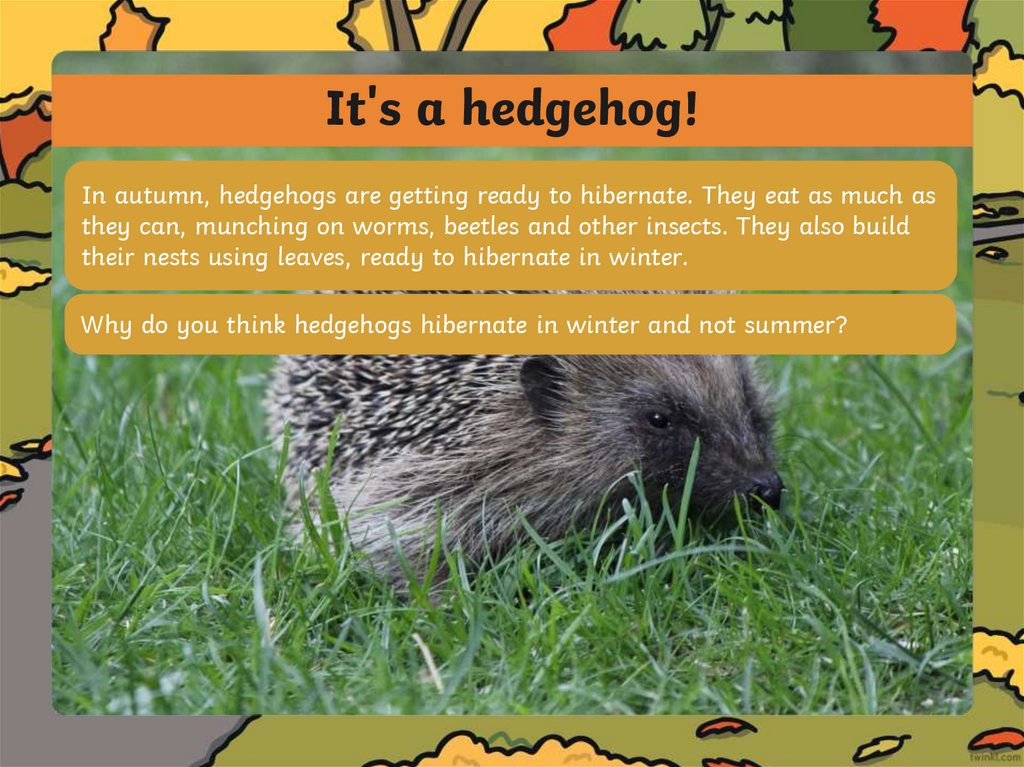 It's a hedgehog!In autumn, hedgehogs are getting ready to hibernate. They eat as much as