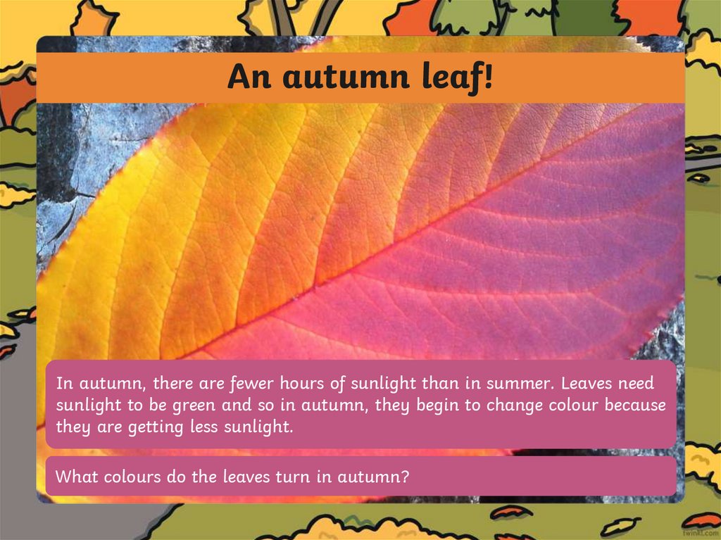 An autumn leaf!In autumn, there are fewer hours of sunlight than in summer. Leaves need