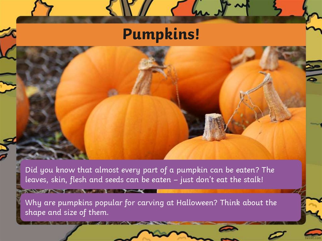 Pumpkins!Did you know that almost every part of a pumpkin can be eaten? The