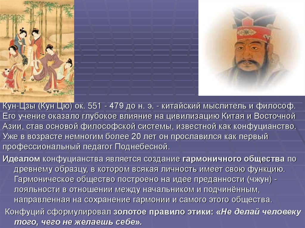 Кун-Цзы (Кун Цю) ок. 551 - 479 до н. э. - китайский мыслитель и философ.Его учение оказало глубокое влияние на цивилизацию Китая и Восточной