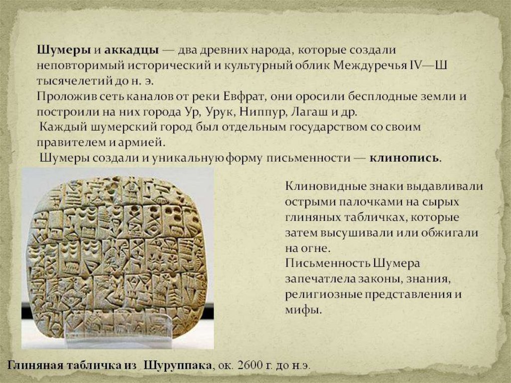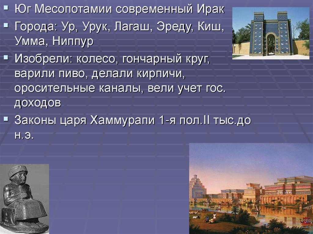 Юг Месопотамии современный ИракГорода: Ур, Урук, Лагаш, Эреду, Киш,