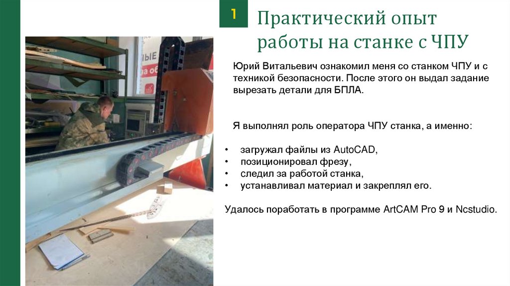Я выполнял роль оператора ЧПУ станка, а именно: