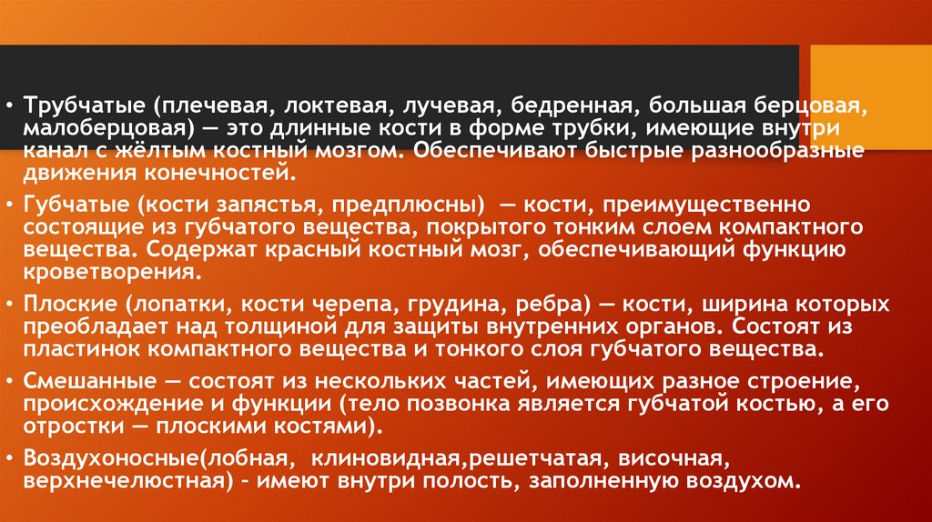 • Трубчатые (плечевая, локтевая, лучевая, бедренная, большая берцовая,малоберцовая) — это длинные кости в форме трубки, имеющие внутри