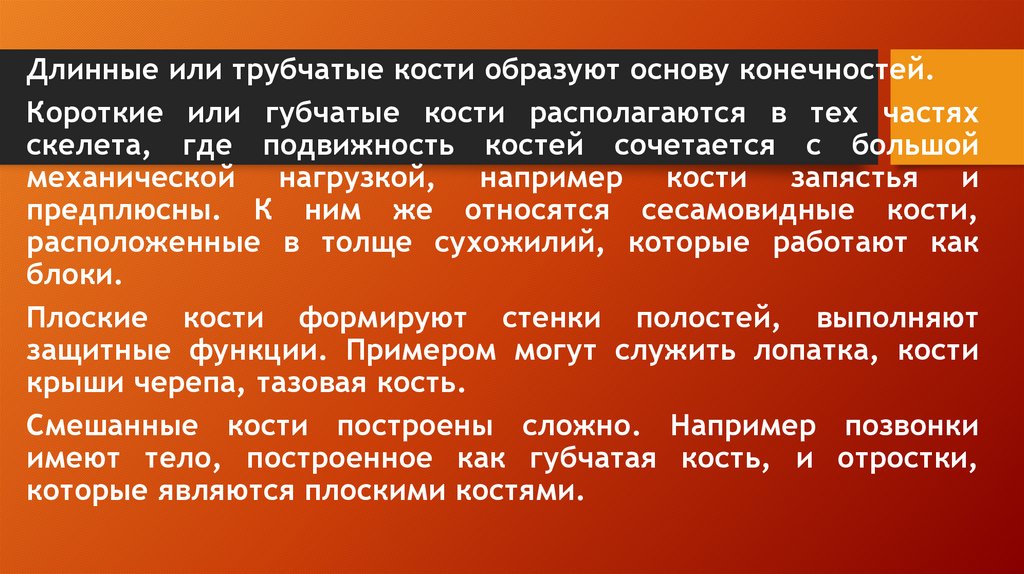 • Длинные или трубчатые кости;• Короткие или губчатые кости;