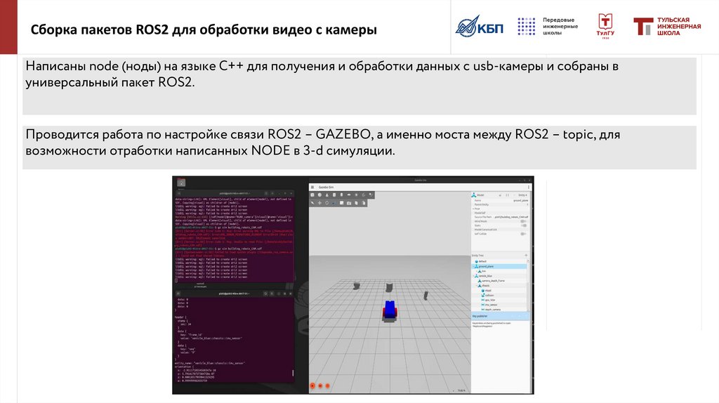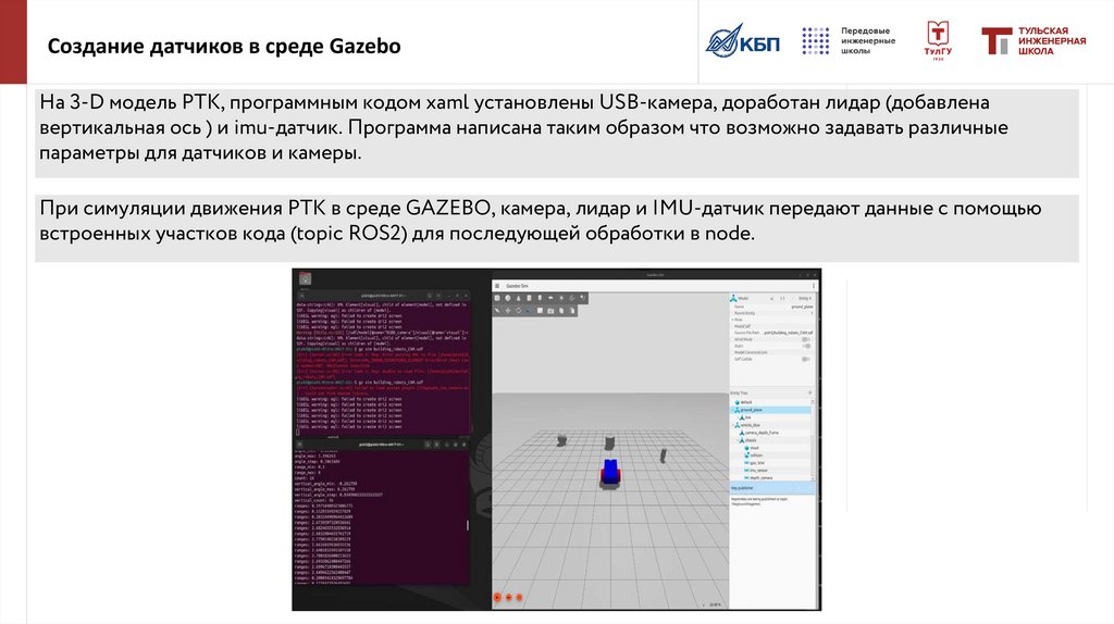 При симуляции движения РТК в среде GAZEBO, камера, лидар и IMU-датчик передают данные с помощью