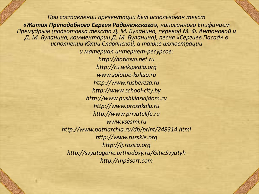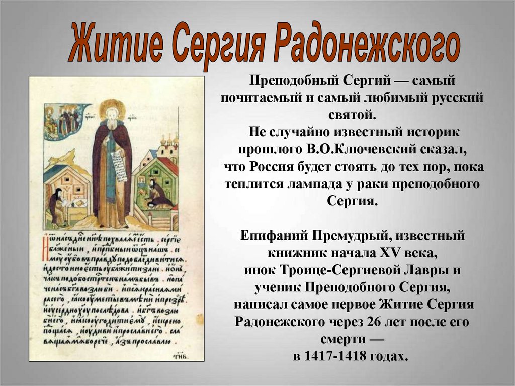 При составлении презентации был использован текст«Жития Преподобного Сергия Радонежского», написанного Епифанием
