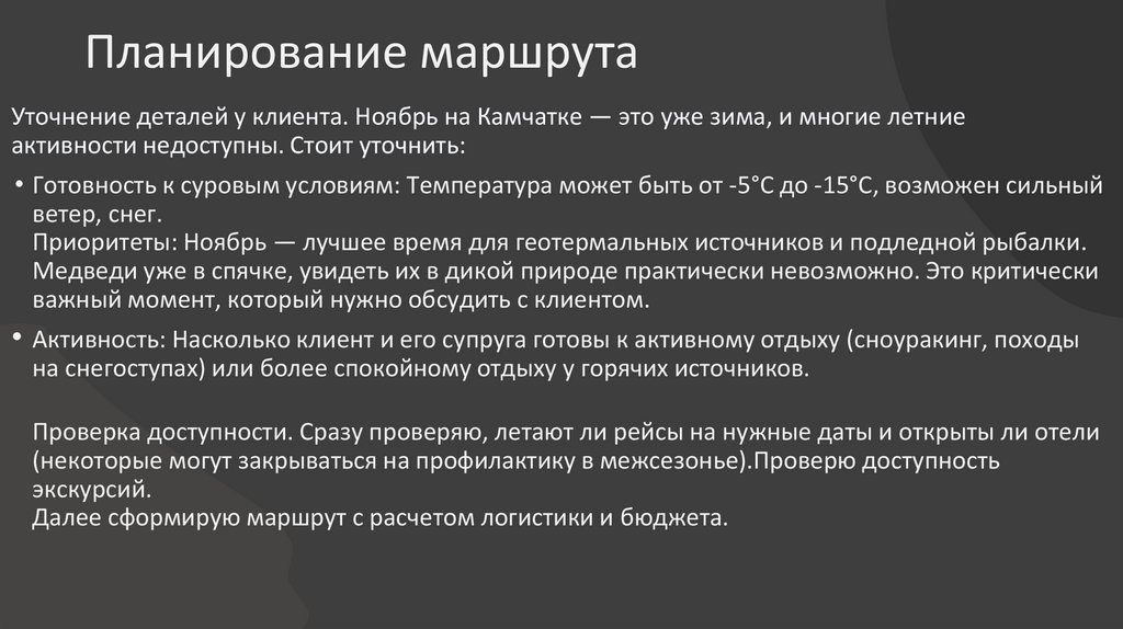 Планирование маршрутаУточнение деталей у клиента. Ноябрь на Камчатке — это уже зима, и многие летние