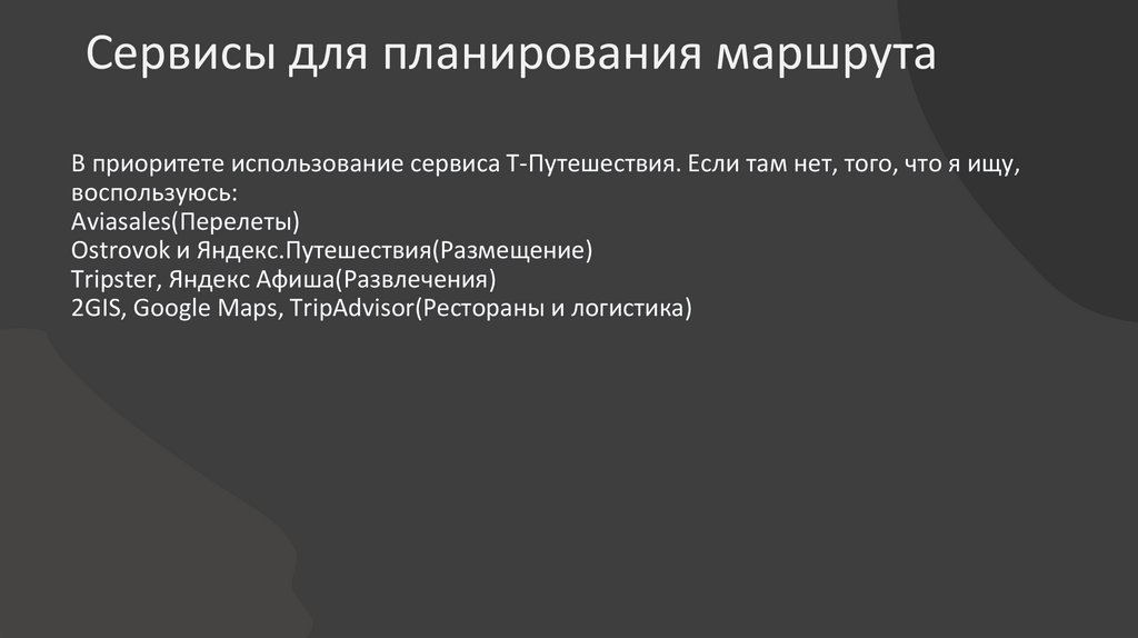 Сервисы для планирования маршрутаВ приоритете использование сервиса Т-Путешествия. Если там нет, того, что я ищу,
