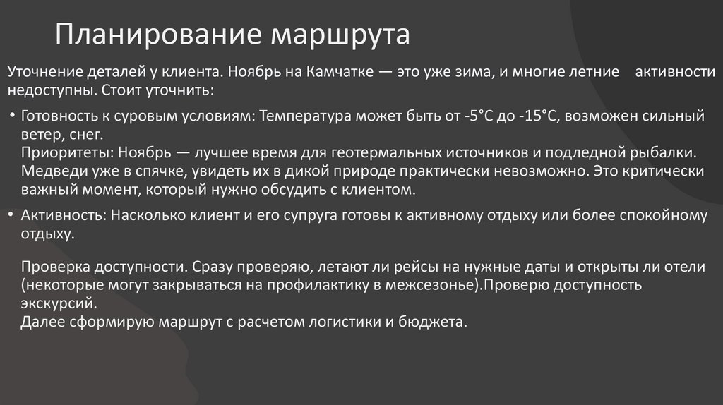 Планирование маршрутаУточнение деталей у клиента. Ноябрь на Камчатке — это уже зима, и многие летние активности