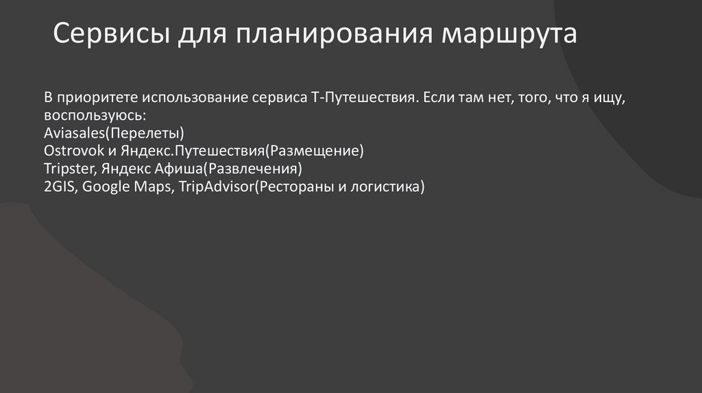 Сервисы для планирования маршрутаВ приоритете использование сервиса Т-Путешествия. Если там нет, того, что я ищу,
