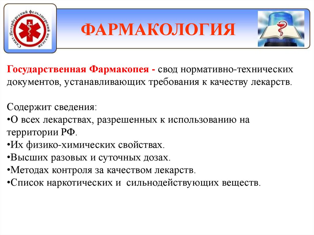 ФАРМАКОЛОГИЯГосударственная Фармакопея - свод нормативно-технических