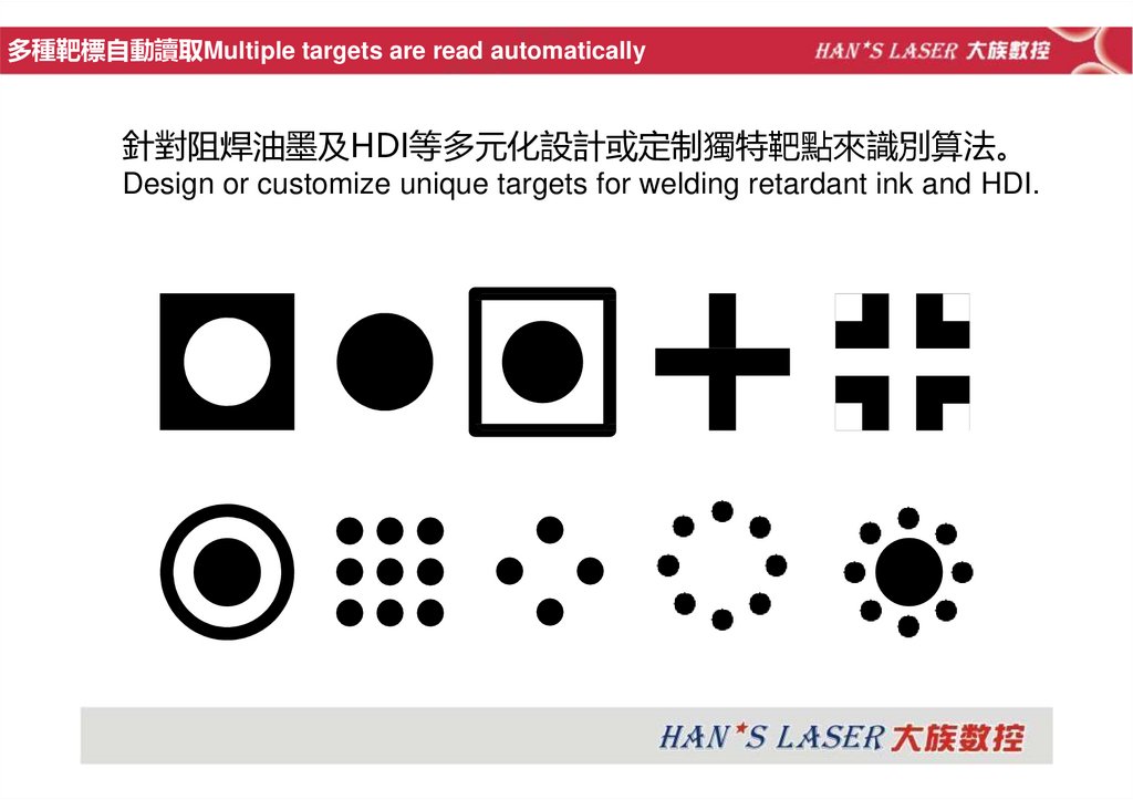 多種靶標自動讀取Multiple targets are read automatically針對阻焊油墨及HDI等多元化設計或定制獨特靶點來識別算法。