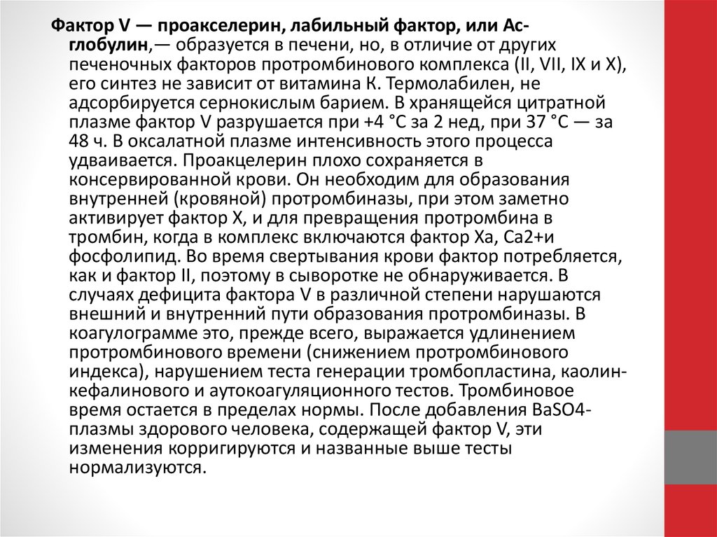 Фактор V — проакселерин, лабильный фактор, или Асглобулин,— образуется в печени, но, в отличие от другихпеченочных факторов протромбинового комплекса (II, VII, IX и X),