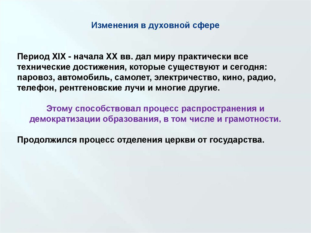 Изменения в духовной сфереПериод XIX - начала XX вв. дал миру практически все
