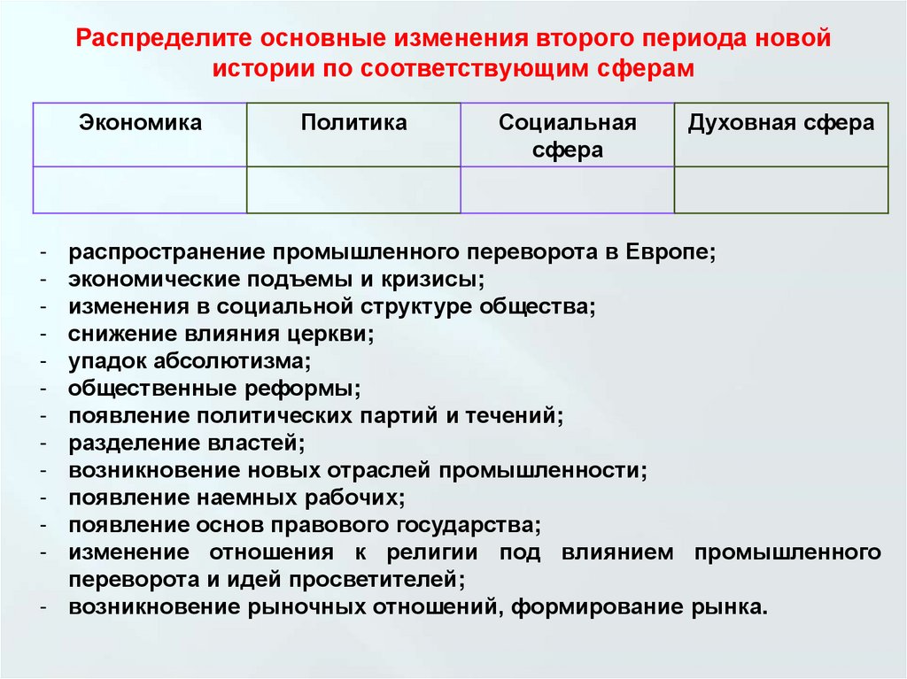 Распределите основные изменения второго периода новойистории по соответствующим сферам