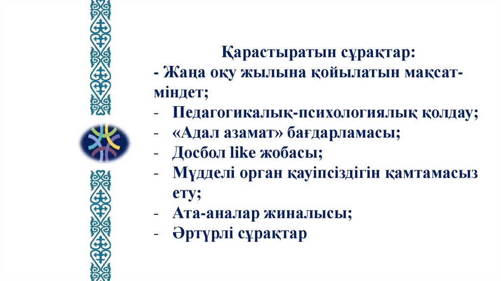 Қарастыратын сұрақтар:- Жаңа оқу жылына қойылатын мақсатміндет;