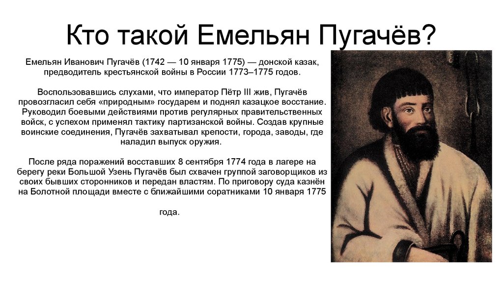 Кто такой Емельян Пугачёв?Емельян Иванович Пугачёв (1742 — 10 января 1775) — донской казак,