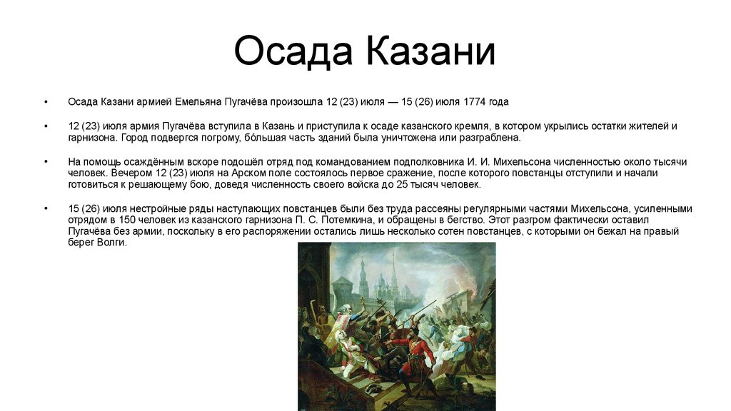 Осада КазаниОсада Казани армией Емельяна Пугачёва произошла 12 (23) июля — 15 (26) июля 1774 года