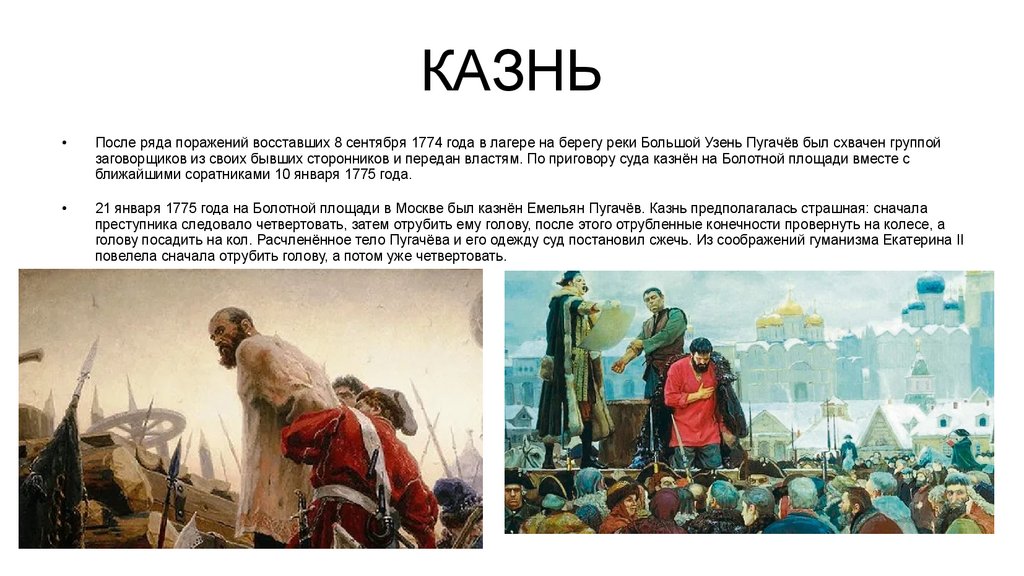 КАЗНЬПосле ряда поражений восставших 8 сентября 1774 года в лагере на берегу реки Большой Узень Пугачёв был схвачен группой
