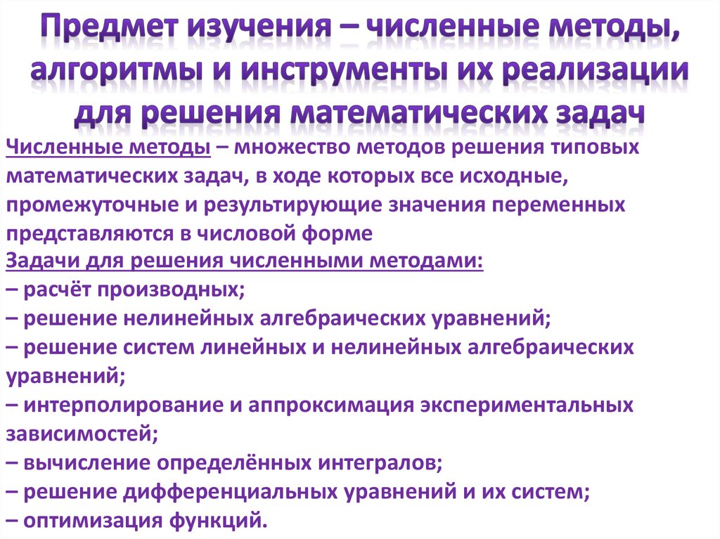 Численные методы – множество методов решения типовыхматематических задач, в ходе которых все исходные,