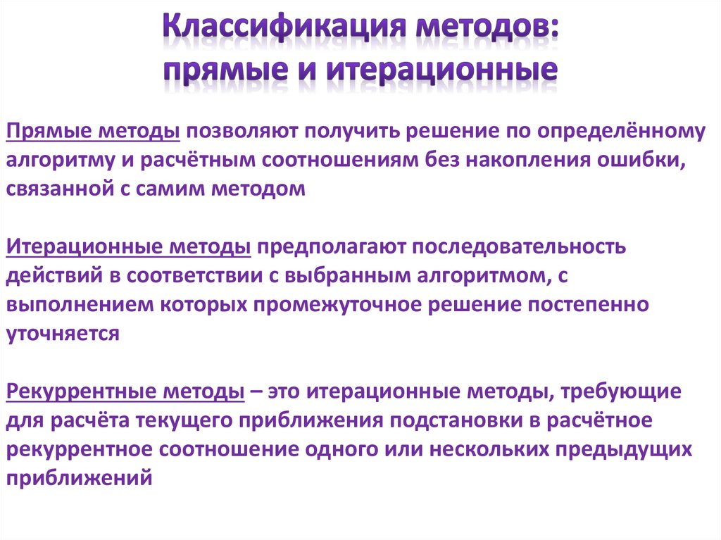 Прямые методы позволяют получить решение по определённомуалгоритму и расчётным соотношениям без накопления ошибки,