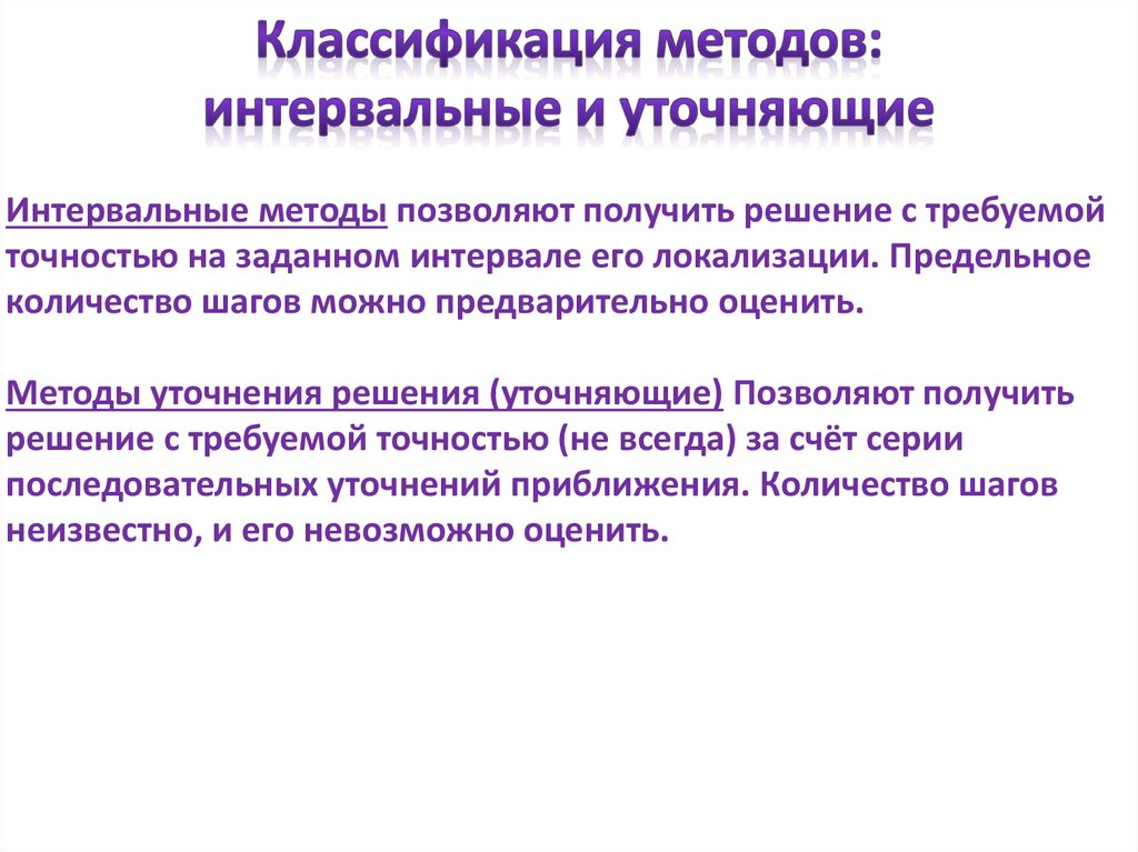 Интервальные методы позволяют получить решение с требуемойточностью на заданном интервале его локализации. Предельное