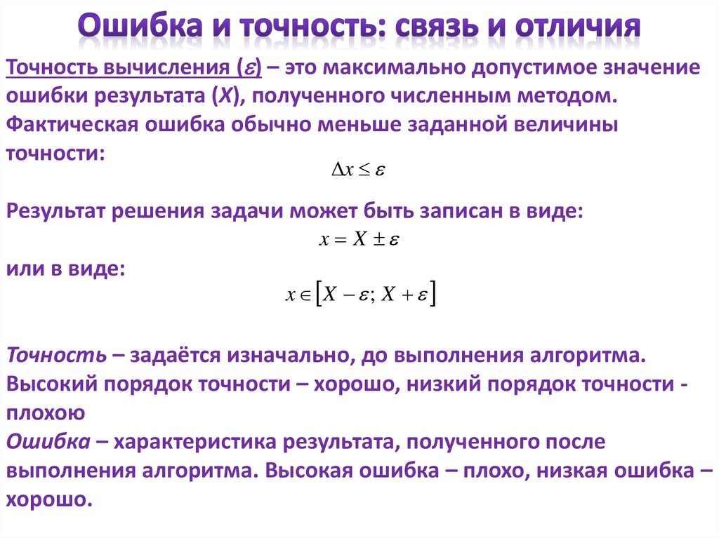 Точность вычисления ( ) – это максимально допустимое значениеошибки результата (X), полученного численным методом.