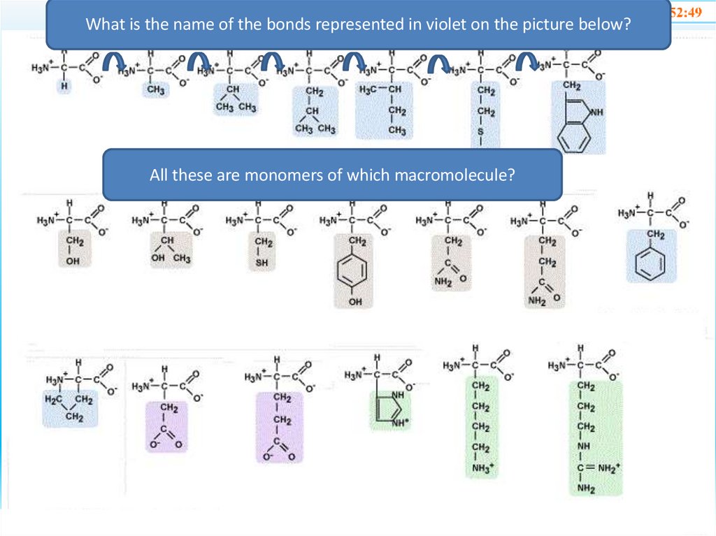What is the name of the bonds represented in violet on the picture below?All these are monomers of which macromolecule?