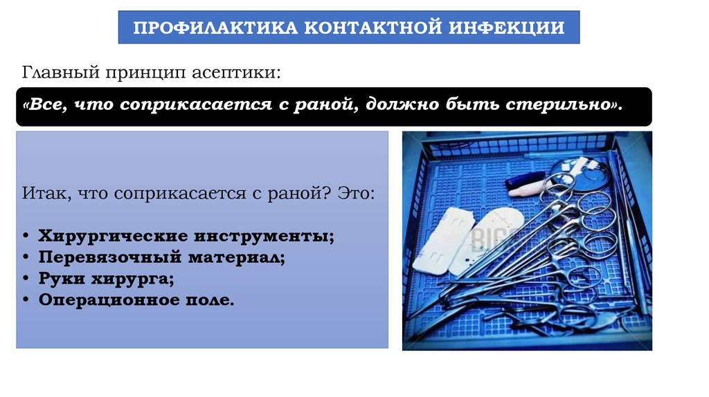 стерильности инструментов, перевязочного материала, рук хирурга,