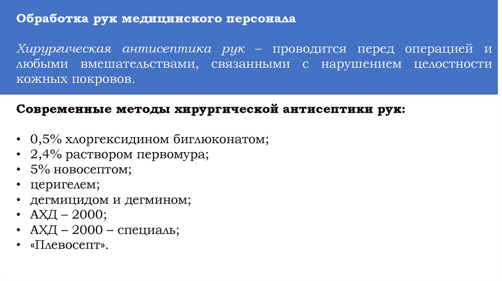 Обработка рук медицинского персоналаХирургическая антисептика рук – проводится перед операцией и