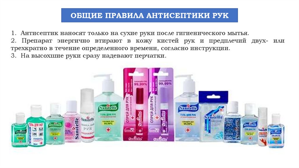 ОБЩИЕ ПРАВИЛА АНТИСЕПТИКИ РУК1. Антисептик наносят только на сухие руки после гигиенического мытья.
