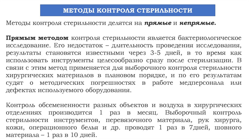 МЕТОДЫ КОНТРОЛЯ СТЕРИЛЬНОСТИМетоды контроля стерильности делятся на прямые и непрямые.