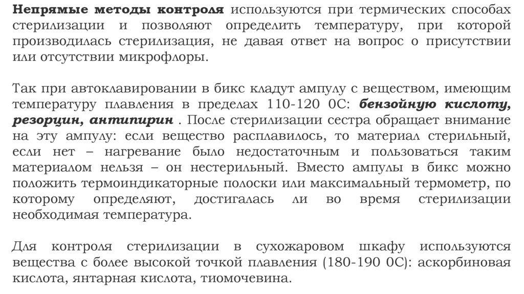 Непрямые методы контроля используются при термических способахстерилизации и позволяют определить температуру, при которой