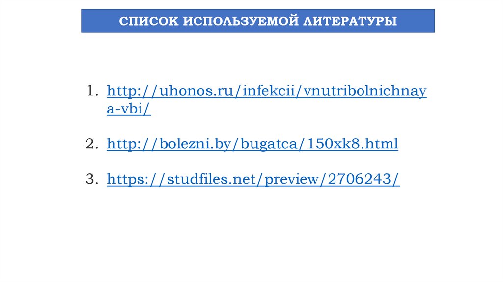 СПИСОК ИСПОЛЬЗУЕМОЙ ЛИТЕРАТУРЫ1. http://uhonos.ru/infekcii/vnutribolnichnay
