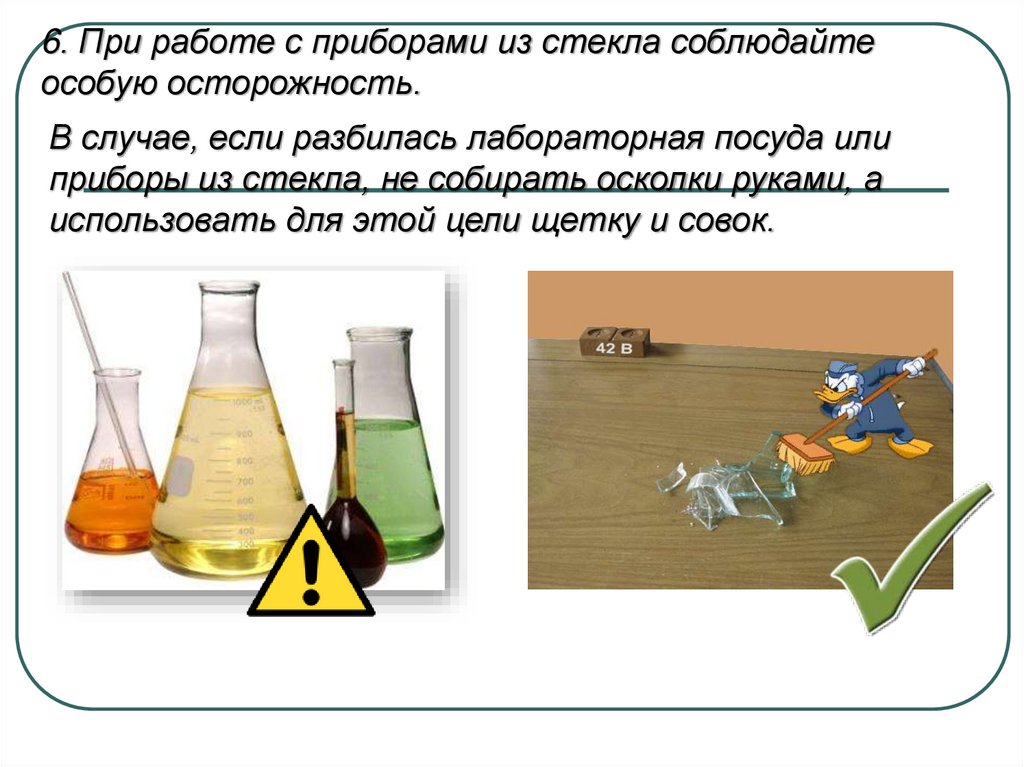 6. При работе с приборами из стекла соблюдайтеособую осторожность.