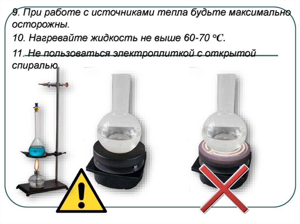 9. При работе с источниками тепла будьте максимальноосторожны.