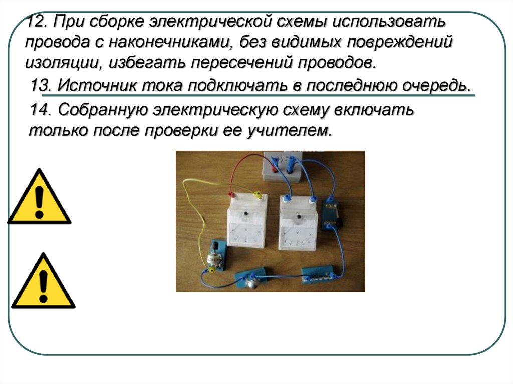 12. При сборке электрической схемы использоватьпровода с наконечниками, без видимых повреждений