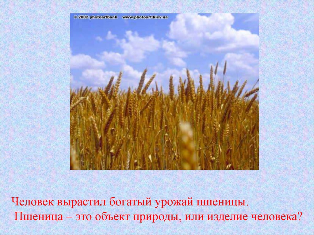 Человек вырастил богатый урожай пшеницы.Пшеница – это объект природы, или изделие человека?