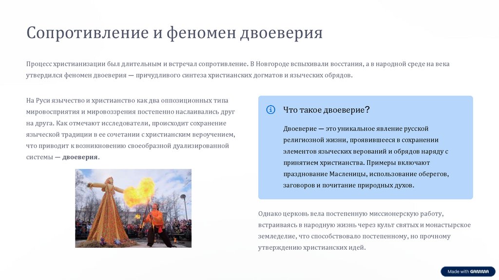 Сопротивление и феномен двоеверияПроцесс христианизации был длительным и встречал сопротивление. В Новгороде вспыхивали восстания, а в народной среде на века