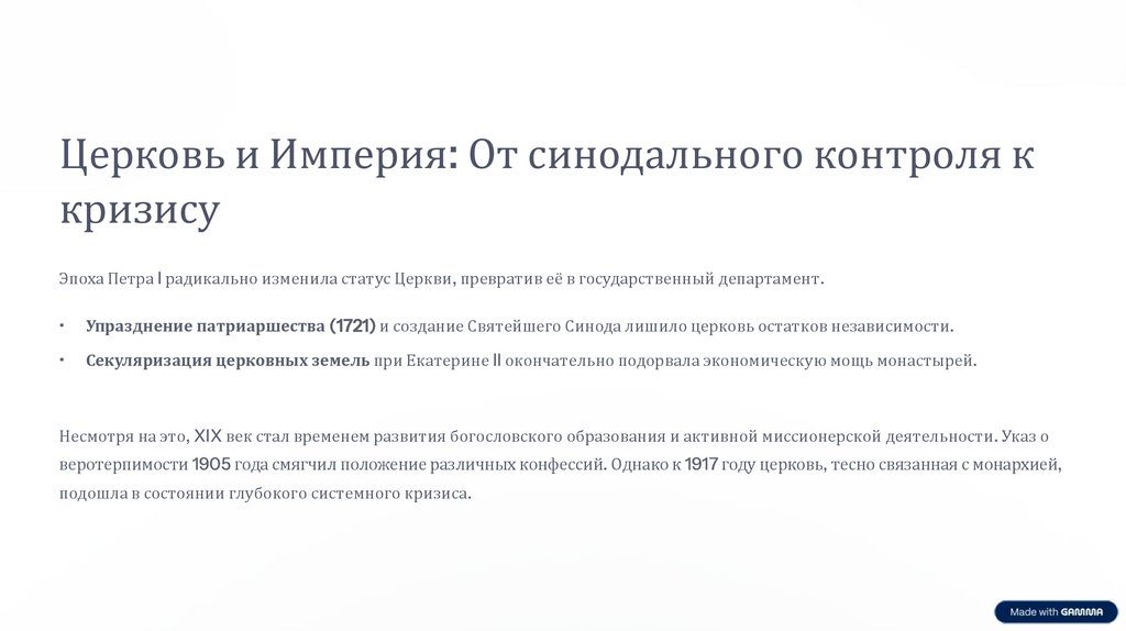 Упразднение патриаршества (1721) и создание Святейшего Синода лишило церковь остатков независимости.