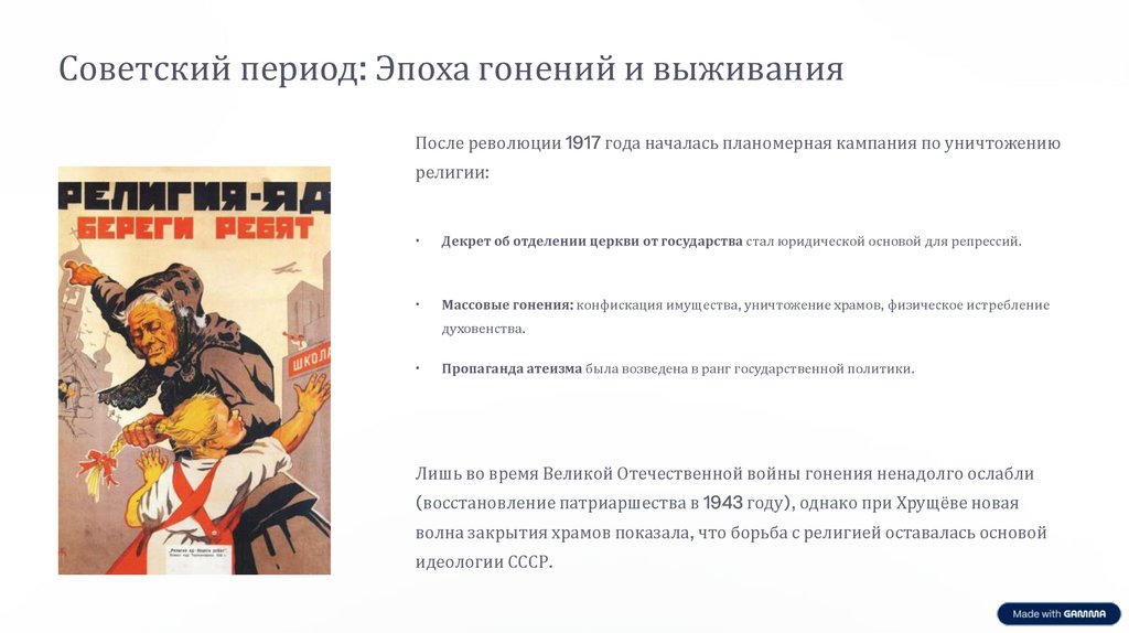 Советский период: Эпоха гонений и выживанияПосле революции 1917 года началась планомерная кампания по уничтожению