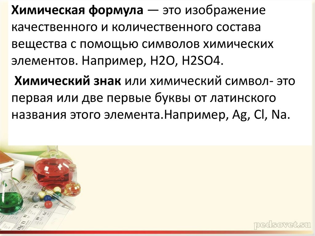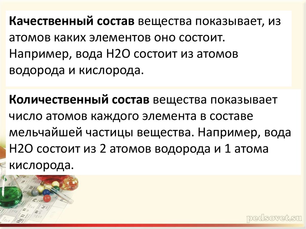 Качественный состав вещества показывает, изатомов каких элементов оно состоит.