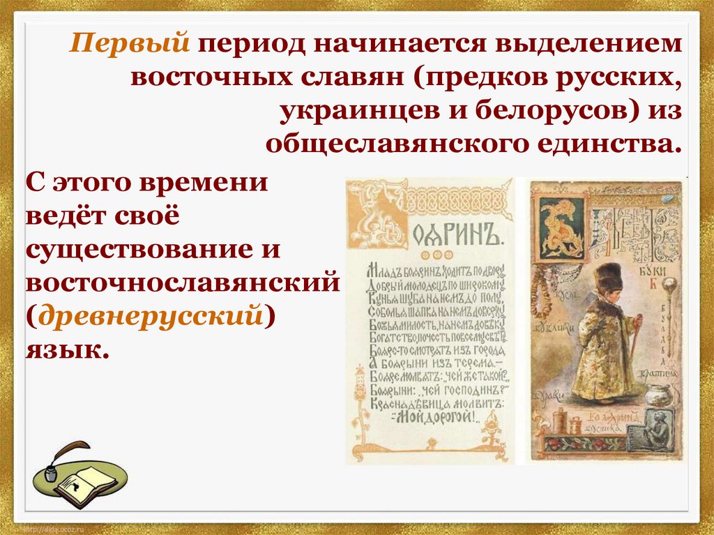 Первый период начинается выделениемвосточных славян (предков русских,