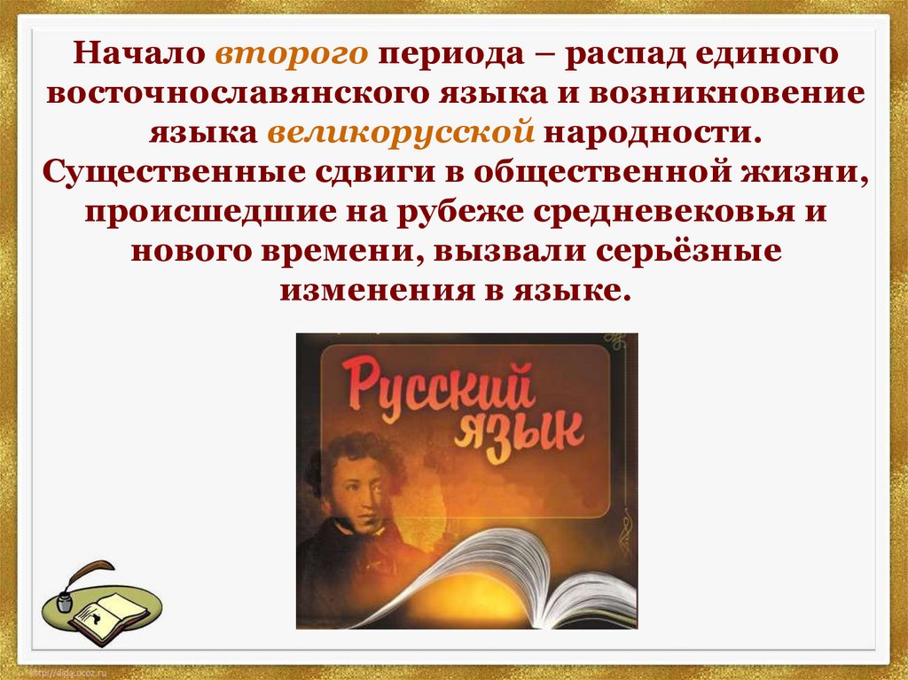 Начало второго периода – распад единоговосточнославянского языка и возникновение