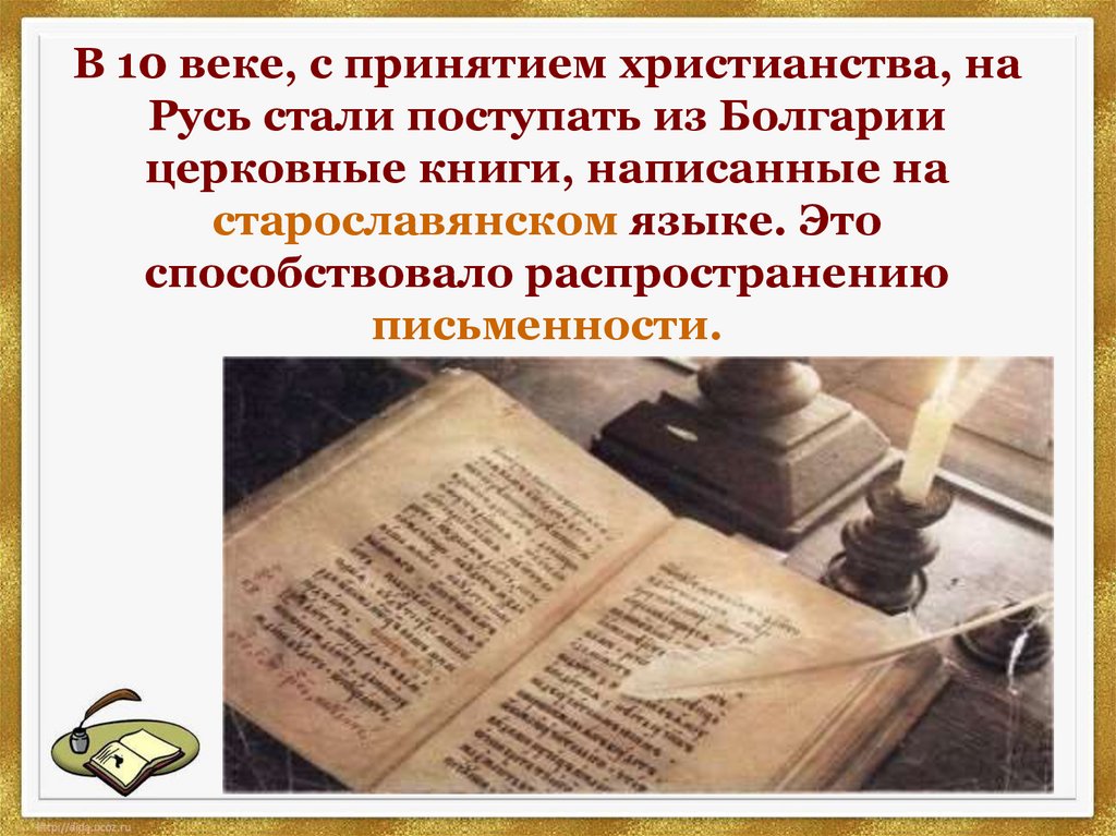 В 10 веке, с принятием христианства, наРусь стали поступать из Болгарии