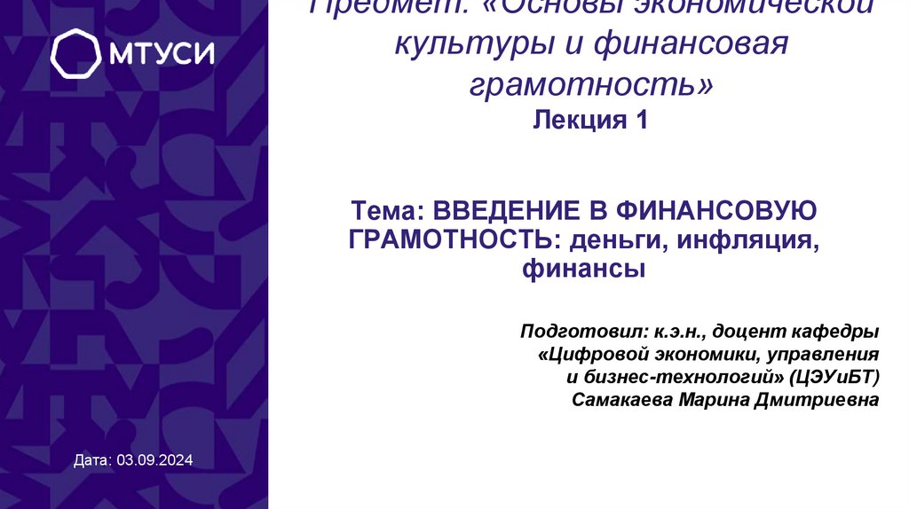 1. Предмет: «Основы экономической культуры и финансовая грамотность» Лекция 1