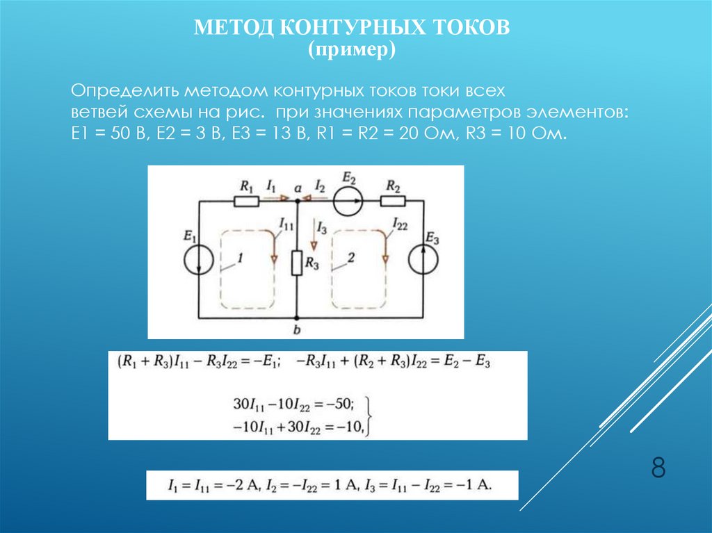 7. В расчет вводятся контурные токи – это фиктивные токи, которые замыкаются в независимых замкнутых контурах, отличающихся друг