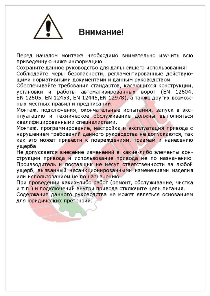 EN 12605, EN 12453, EN 12445,EN 12978), а также других возможных местных правил и предписаний.