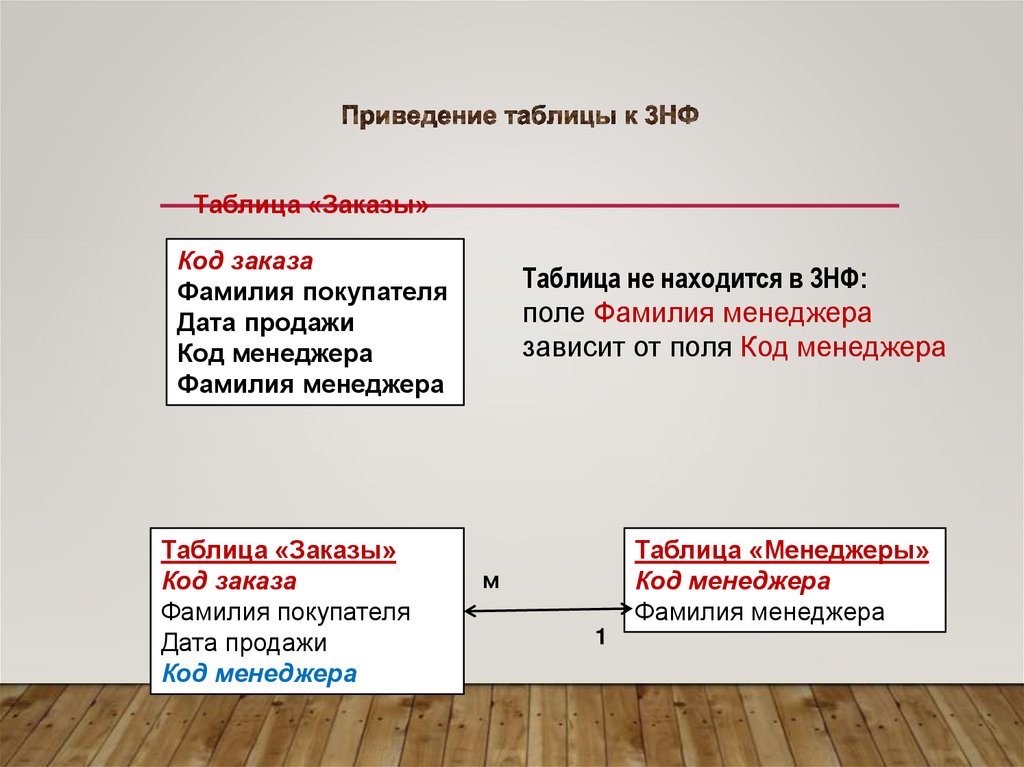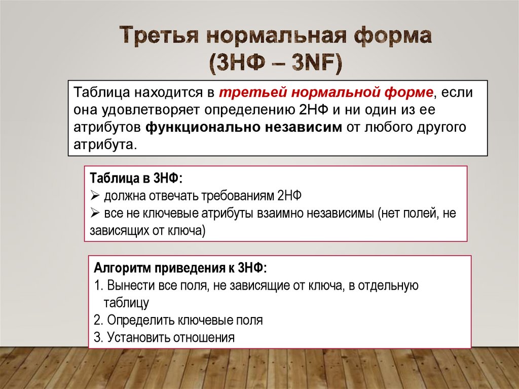 Таблица находится в третьей нормальной форме, еслиона удовлетворяет определению 2НФ и ни один из ее